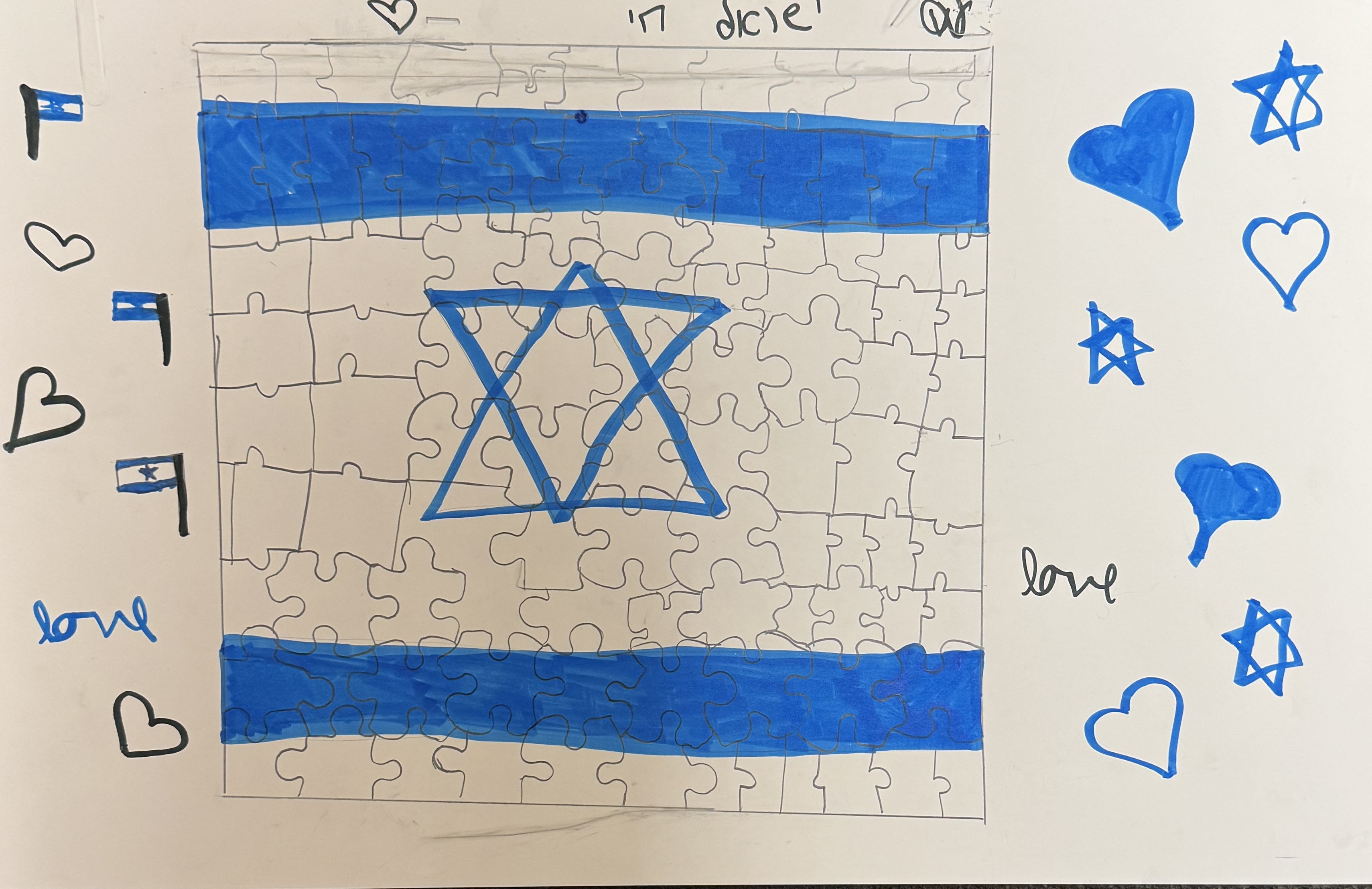 A puzzle reminds me of how all of the Jewish people stick together even though we don't live in the same country. We are together because Hashem gave us the same mitzvot and we learn things like Parsha and Tefillot. In Israel there is a horrible war going on. I think we're going to win because Hashem trusts us like we trust Hashem. I think we should never fight, but if we fight for the right thing, Hashem will help us. See above In my poster I drew the Israeli flag into a puzzle because the flag symbolizes the Jewish people and we stick together. Jewish studies