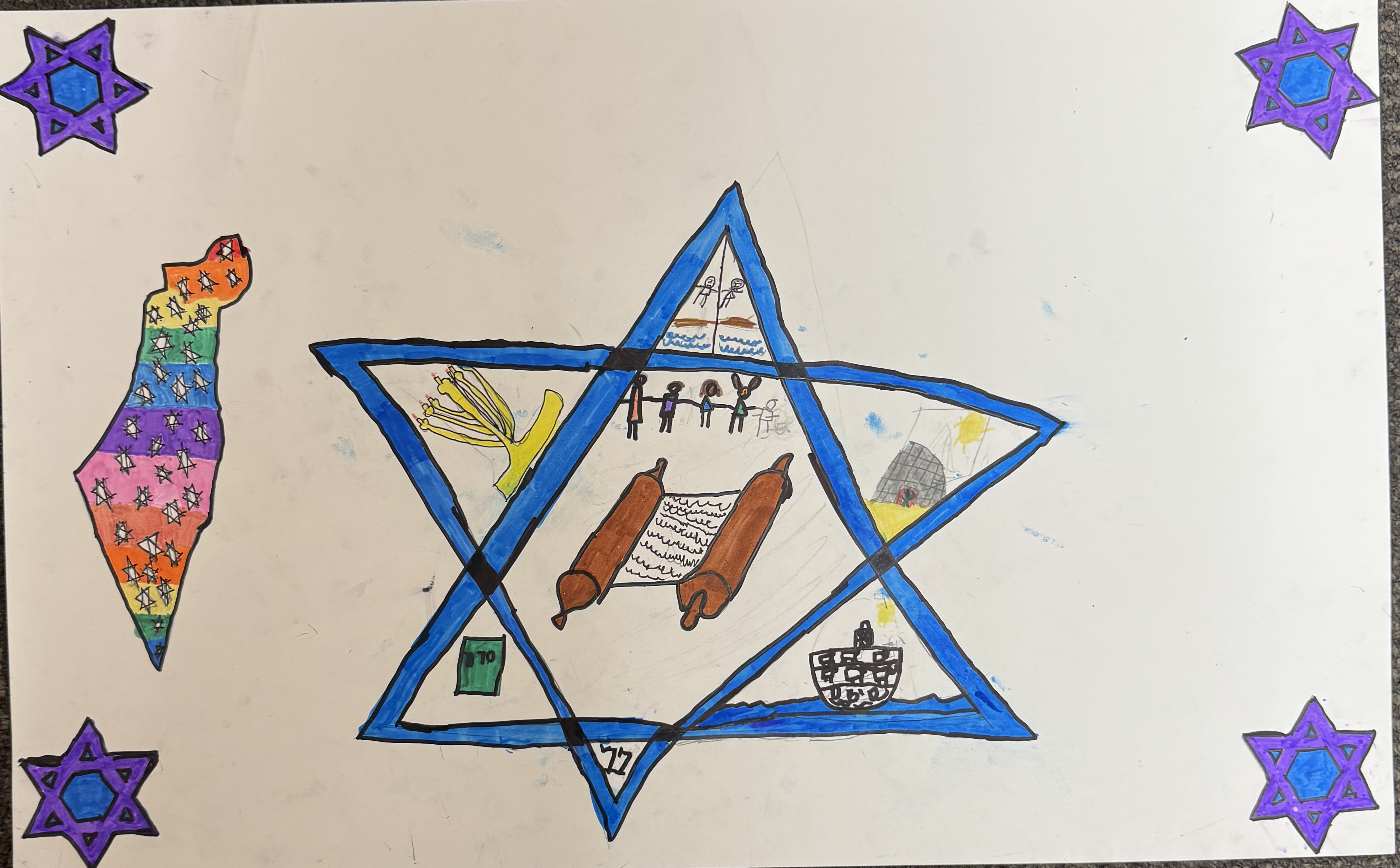 The reason we love Israel because our ancestors grew up there. We also love Israel because of all of the miracles that happened to our nation. We are so glad that Hashem gave us Eretz Yisrael. See above. In our poster we drew a big Magen David symbolizing the Jewish people. In the center we have our Torah. In each individual section, we have the miracles that have happened to us, such as, Kriat Yam Suf, Har Sinai-Matan Torah, Chanukah Menorah, Noach and the Tayva, and a Siddur. In our map of israel we drew lots of Magen David's representing all of the Jewish people in the land. Jewish Studies