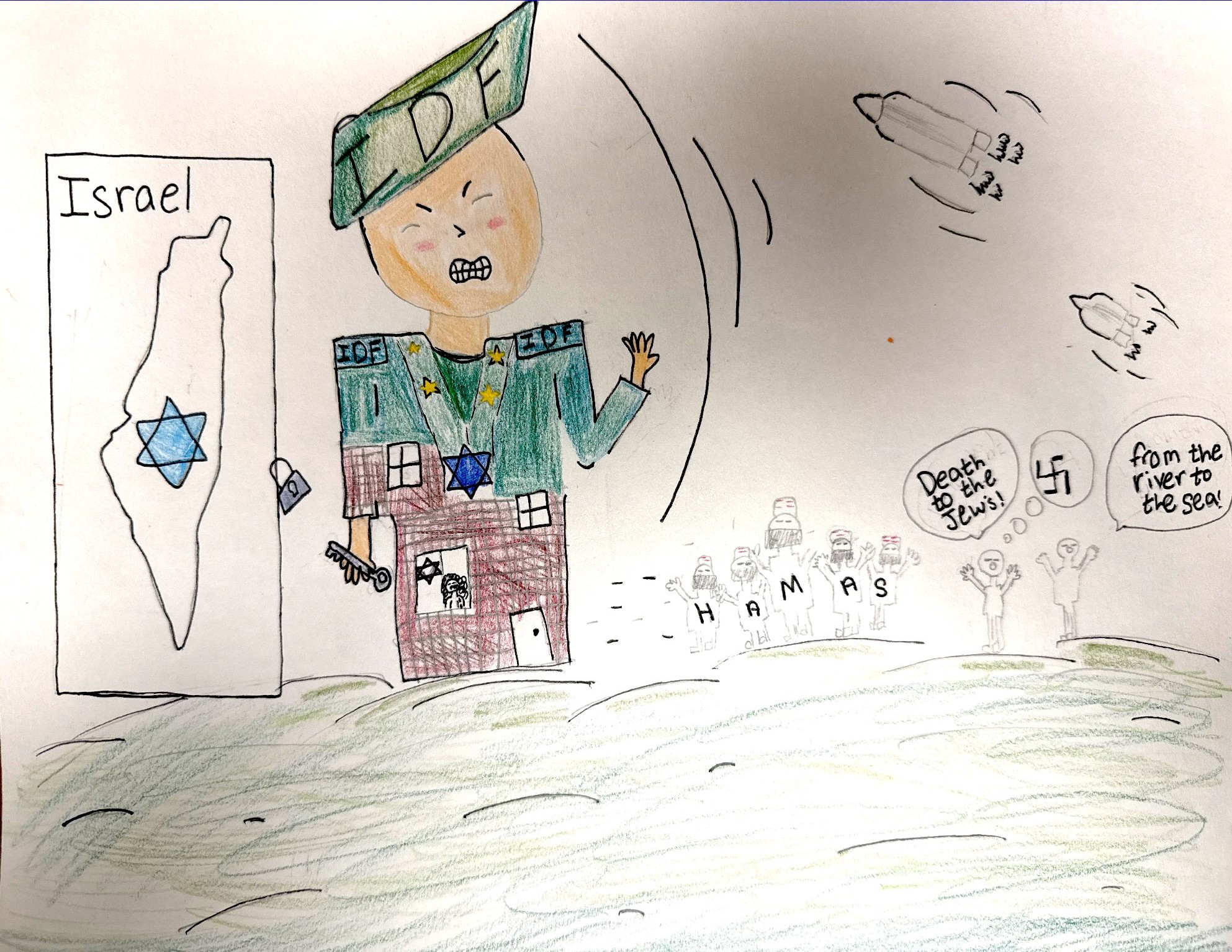 My work represents an IDF soldier constructed as a house with a child looking out of the window and other additional windows. That child represents me when I lived in Israel and looked outside into the real world, full of antisemitism, and it was even worse when I moved to the States. In front of the soldier/building is a line representing the force that he’s pushing against the rockets, Hamas members, and behind them are the protesters. The protesters are there because they motivate Hamas and fuel the flame of the growing antisemitism, but hide behind Hamas. Behind the soldier/building is Israel, locked away from it all, it is being protected by the soldiers in Israel (the large soldier represents the entire IDF) who give their lives to keep it safe.