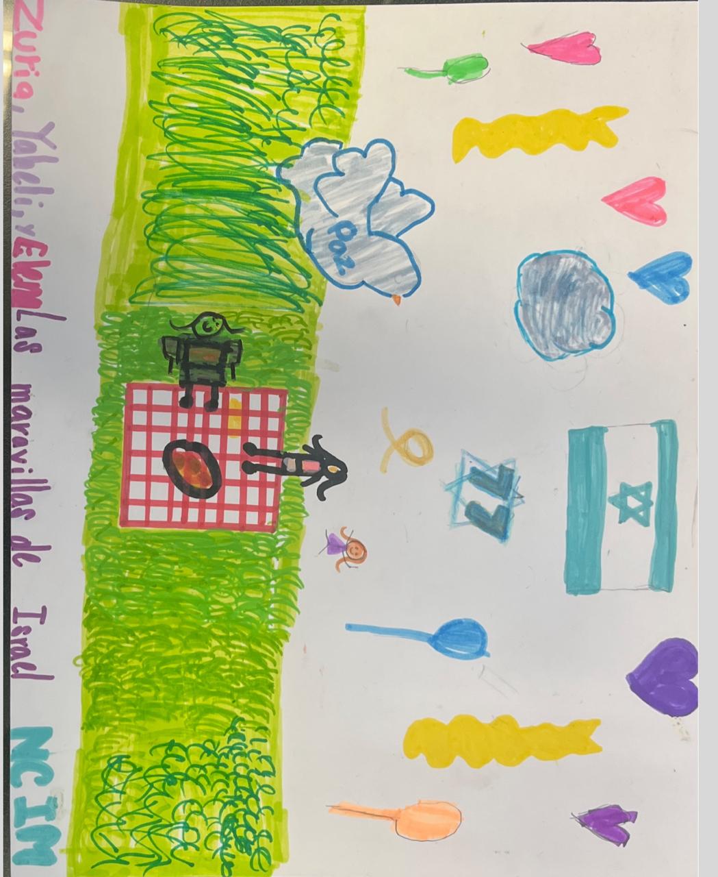 The name of the poster is Las Maravillas de Israel. (The wonders of Israel) The main elements are the Israeli flag, the dove of Peace and the number 77, which is the שniversary of Israel. People in our poster are eating hummus and falafel, celebrating Independence on a picnic. The picture represents Israel seeking peace and friendship. Israel is a country that accepts people from different cultures, tastes, and ways of thinking. The viewers should inspire people to love Israel. We were inspired by the lesson plan Descubriendo lo personal detras del dibujo.