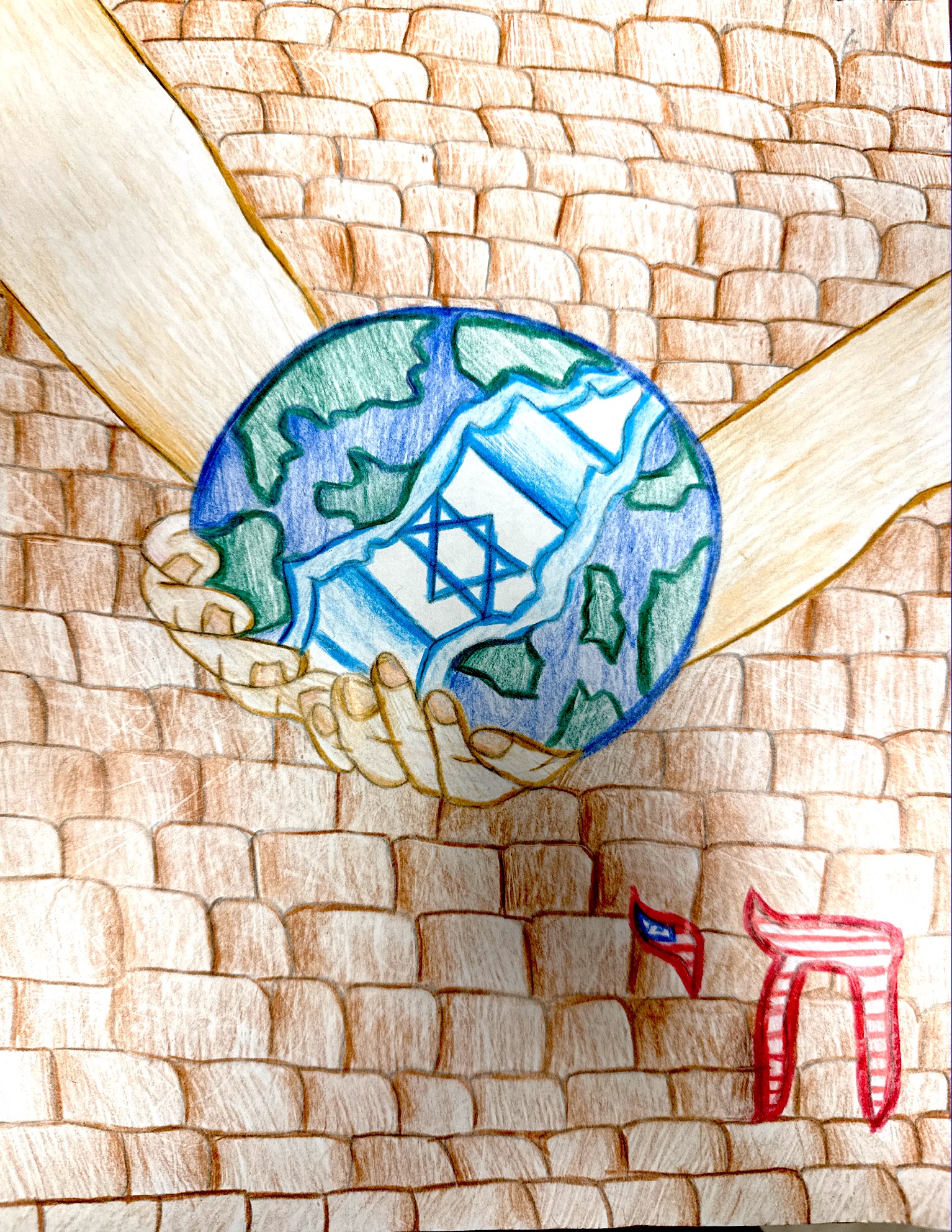 Inside the planet Earth depicted in this drawing stands the state of Israel. The country’s largely exaggerated size represents its overarching value in many individuals' lives, spanning from America to across the globe. In my eyes, Israel symbolizes the resilience of the Jewish nation that has continued to stand strong despite the controversial opinions surrounding its right to exist. In spite of the numerous obstacles and threats they’ve faced over time, the Jews have always upheld their faith in God and maintained an unbreakable connection to their homeland, regardless of whose hands control fell into. Even in modern times, Jewish communities worldwide continue to uphold these age-old values through ritual practices like prayer and the observance of traditional holidays (symbolic of the Kotel in the visuals’ background). Considering how finding time to reflect on the past may be difficult, these practices serve as a reminder of the struggles ancient Jews endured in hopes of securing a more promising future for generations to come. I used the different Yom Ha'atzmaut posters as inspiration.
