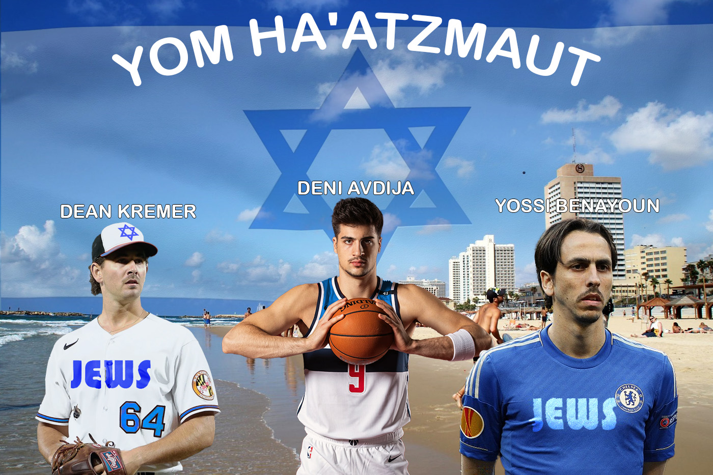 I My poster contains three Israeli sports players. I changed the jerseys of the players to be blue and white to look like the colors of the Israeli flag because I wanted to show how they are representing their country in front of millions of people. When I think of Israel, I think of Tel Aviv so I placed the players in front of a Tel Aviv beach with the Israeli flag in the background. Jews can play sports too. I was inspired by the Maccabiah Poster from 1935. the poster shows a Jewish athlete representing his county so I tried to create a similar sense of pride in my poster.