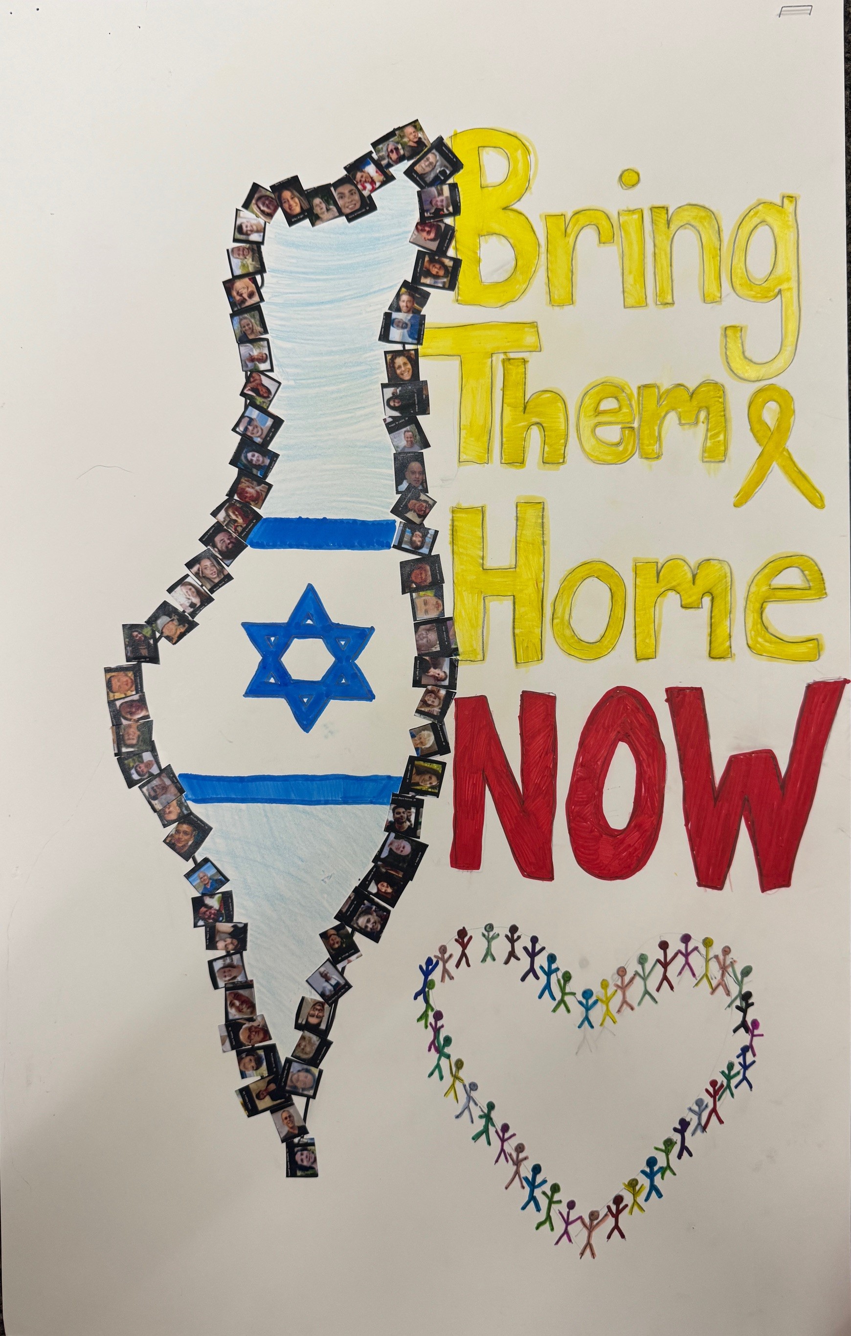 On October 7, 2023 Hamas kidnapped 251 people. This poster reminds us that we will not rest until they are home. We are all one people and cannot rest if one of us is not okay. We are united and praying that the remaining 59 hostages will come home. We keep them in our hearts and will never forget them. CJDS morning assemblies
