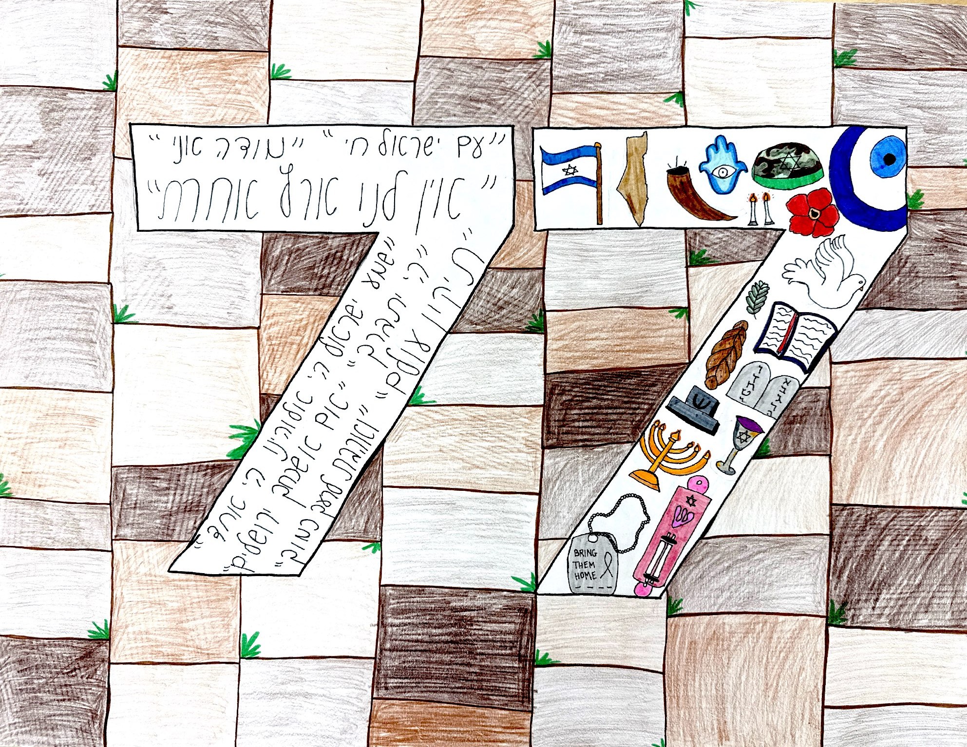 We made this artwork as a special tribute to Yom Ha’atzmaut, also known as Israel’s Independence Day, and its 77th anniversary. To celebrate Israel’s 77th birthday, we put a big “77” in the center of the artwork. The left side of the number has important Hebrew phrases that show the strong connection between the Jewish people, their faith, and the land of Israel. One example is the phrase "Am Yisrael Chai”, which means “The nation of Israel lives.” It stands for the strength and survival of the Jewish people. On the right side, we filled the number with Jewish symbols that represent different parts of Jewish tradition and Israeli culture. These include a menorah, Shabbat candles, the Torah, a dove for peace, and more. These symbols show how Jewish identity brings together the past, present, and future. The background of the artwork is the Kotel, one of the holiest places in Judaism. It reminds us of the deep connection between the Jewish people and the land of Israel. Overall, this artwork is a meaningful way to show faith and national pride. We made this artwork as a special tribute to Yom Ha’atzmaut, also known as Israel’s Independence Day, and its 77th anniversary. To celebrate Israel’s 77th birthday, we put a big “77” in the center of the artwork. The left side of the number has important Hebrew phrases that show the strong connection between the Jewish people, their faith, and the land of Israel. One example is the phrase "Am Yisrael Chai”, which means “The nation of Israel lives.” It stands for the strength and survival of the Jewish people. On the right side, we filled the number with Jewish symbols that represent different parts of Jewish tradition and Israeli culture. These include a menorah, Shabbat candles, the Torah, a dove for peace, and more. These symbols show how Jewish identity brings together the past, present, and future. The background of the artwork is the Kotel, one of the holiest places in Judaism. It reminds us of the deep connection between the Jewish people and the land of Israel. Overall, this artwork is a meaningful way to show faith and national pride. Peace. Yom Ha'atzmaut posters.