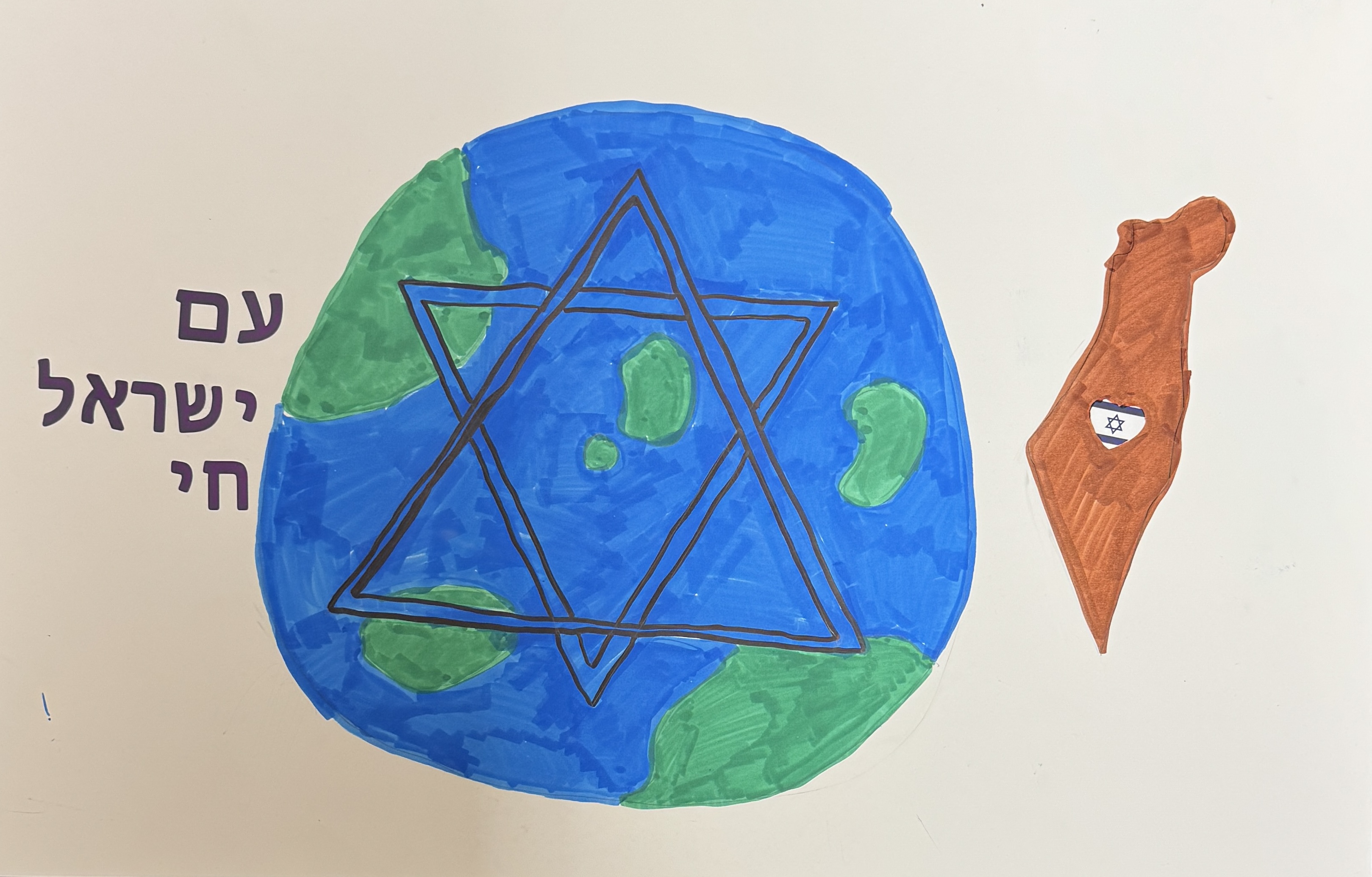 No matter where we are in the world we are all part of the same nation. Hashem gave us this land, so we can rule it together, not so we can fight, but so we can work together in a community. If we have a war or a disagreement, Hashem will be by our side. Even when we are at our lowest, Hashem will make a miracle happen, so we should all say Am Yisrael Chai. See above In my poster I drew a globe with a big Magen David in the center representing how Jewish people are all over the world. We are all working hard to keep Israel. Jewish studies