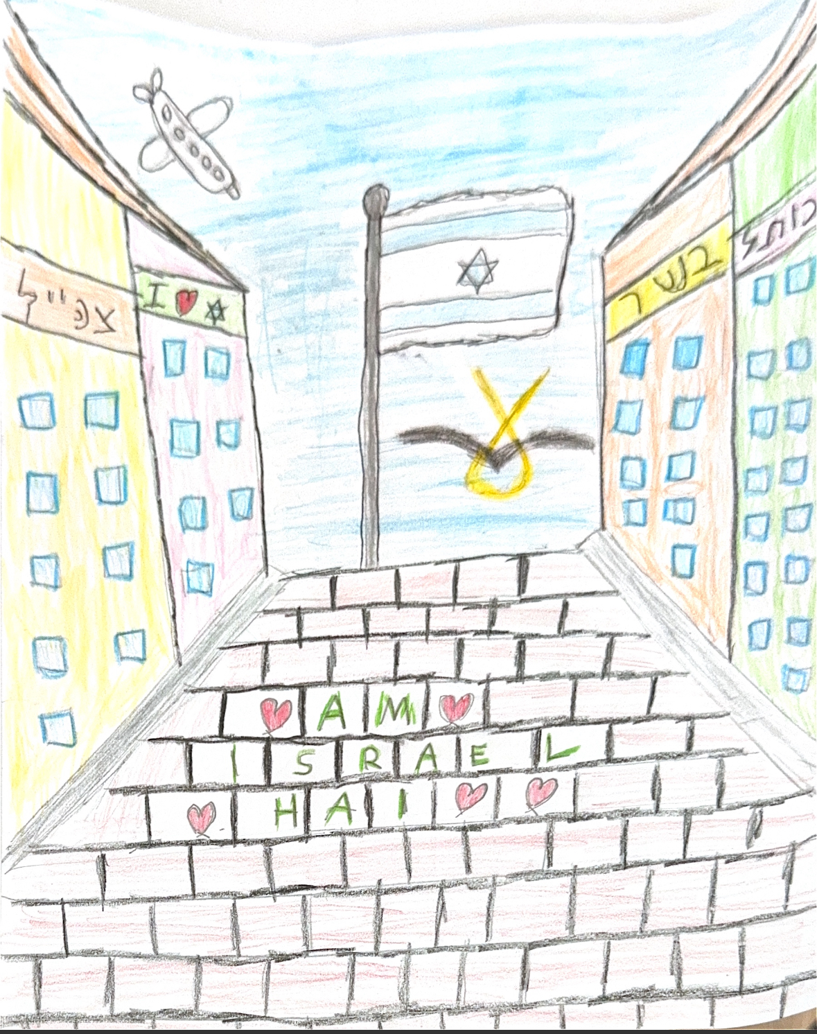 The plane represents all the olim who come to Israel, while the shops with Hebrew names symbolize that Hebrew is a living language.