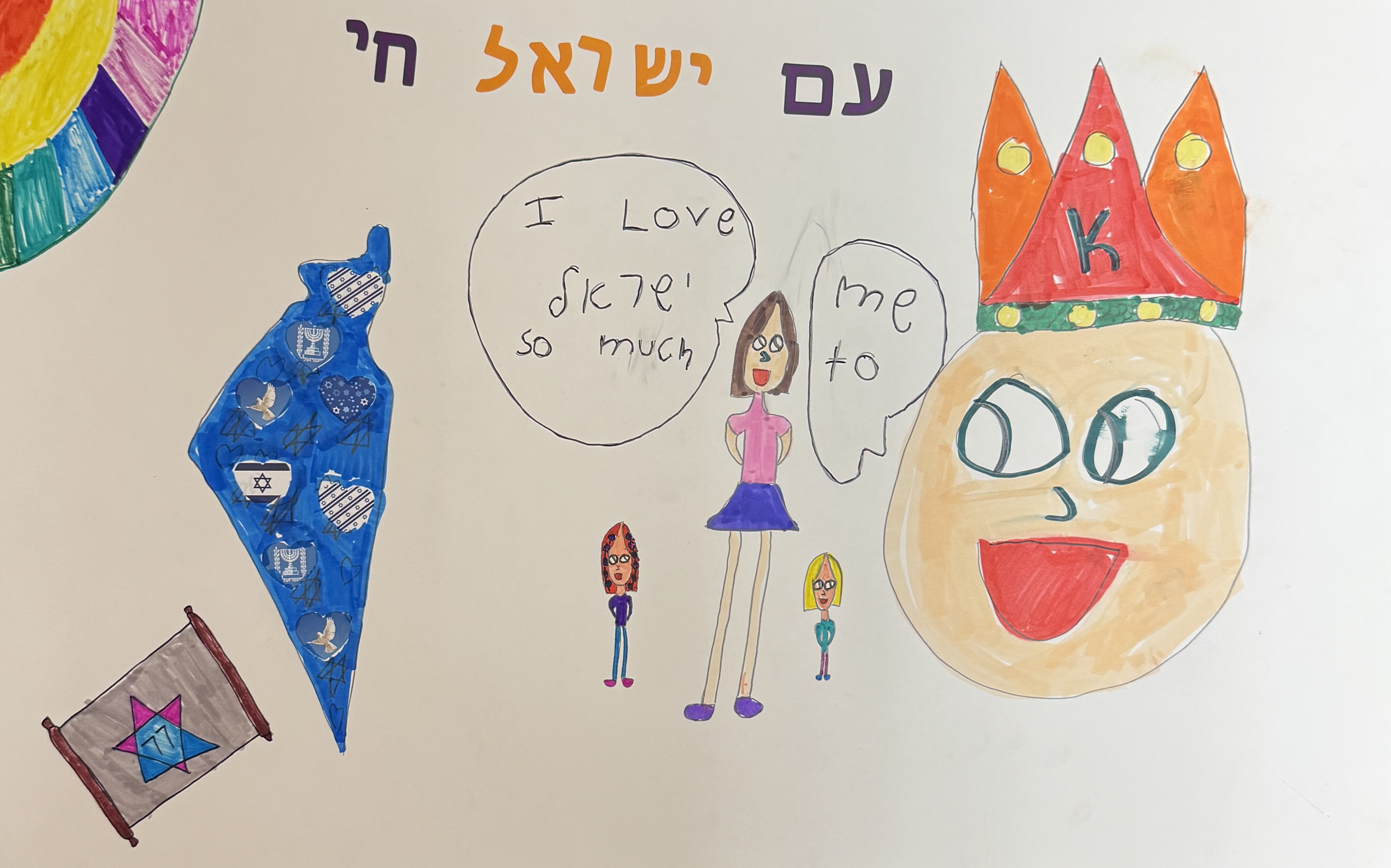 The reason I love Israel is because Hashem promised it all to us. It is our one and only land and we worry about our soldiers because they are our brothers and sisters. On my poster I drew myself and two younger kids next to a map of Israel and I also drew the Torah which is the source of our promise that Hashem gave to us. The kids and me are saying, "I love Israel so much." And Hashem comes up and says, "Me too." Judaic studies/Parsha